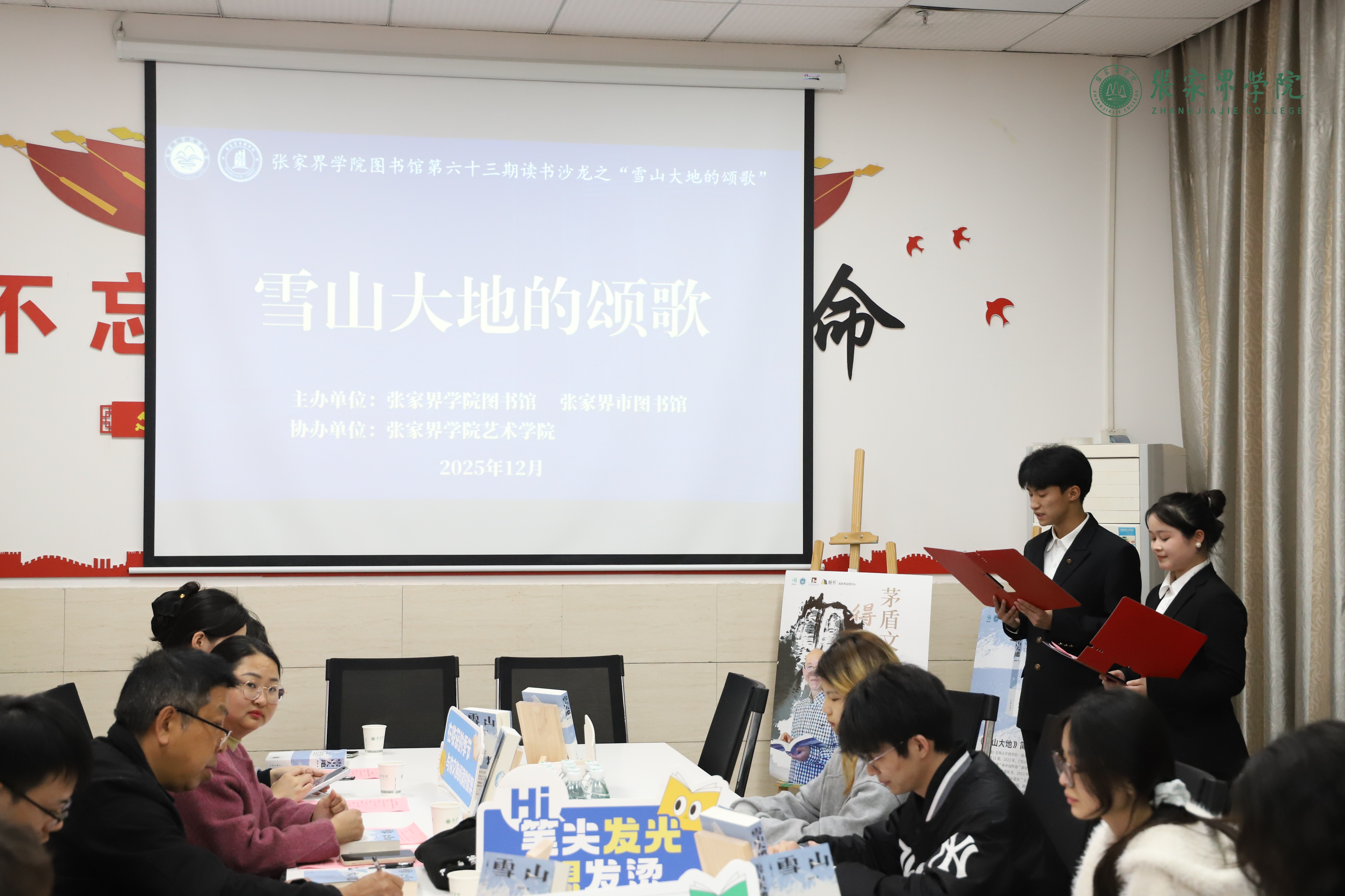 12月10日晚,张家界市图书馆、张家界学院图书馆主办,艺术学院协办的第六十三期读书沙龙“雪山大地的颂歌”活动在图书馆学海厅进行。此次活动由我校文学院教授田茂军担任主讲嘉宾,图书馆副馆长刘欢等师生代表共同参与本次活动。