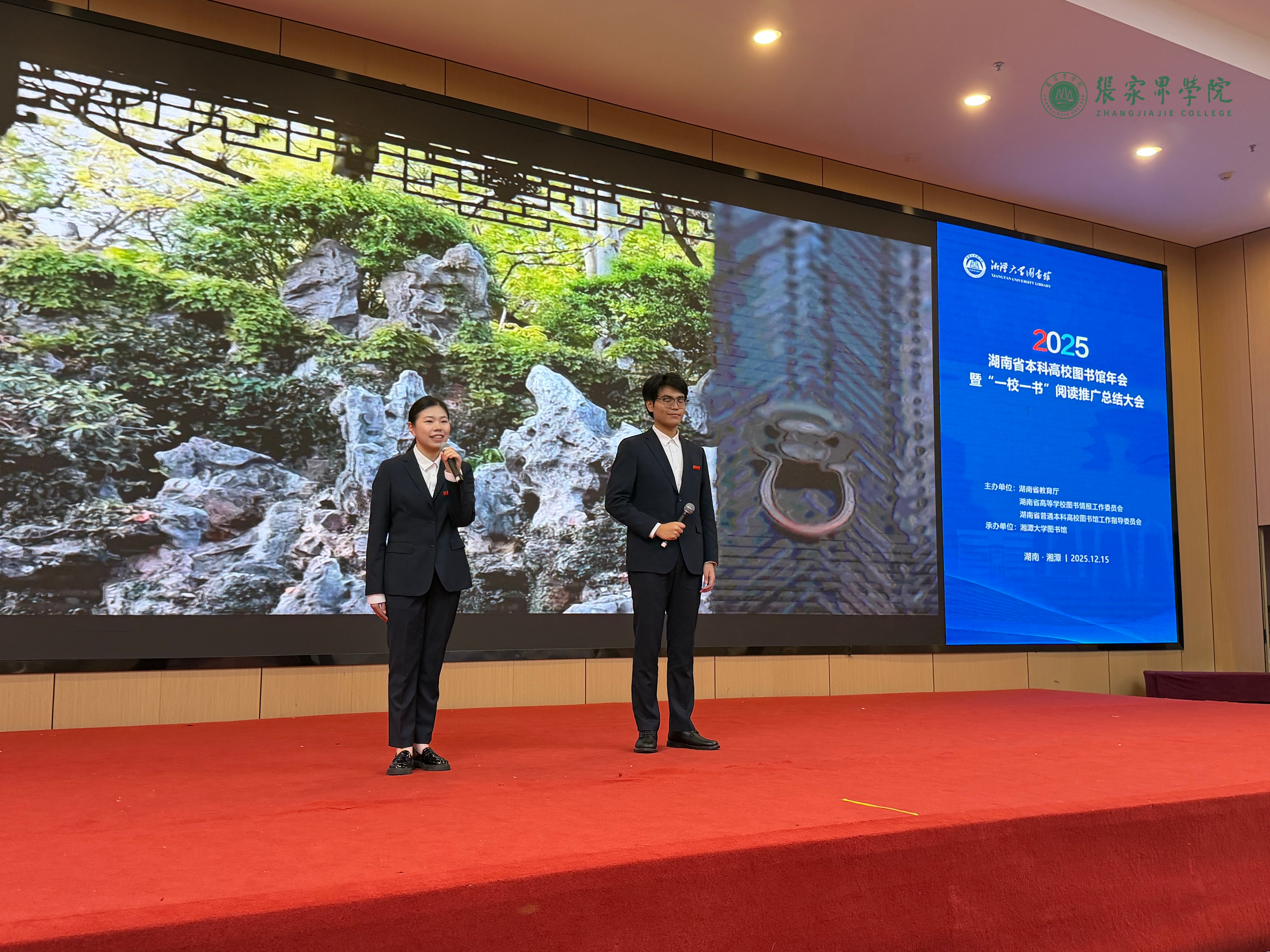 12月15日,2025年湖南省本科高校图书馆年会暨“一校一书”阅读推广总结大会在湘潭举行。张家界学院艺术学院党总支书记刘泳洁,图书馆副馆长刘欢等师生代表参加活动,我校选送的“一校一书”“经典诵读”优秀节目也亮相大会展演环节,展现了学校图书馆建设与阅读推广工作的成果。