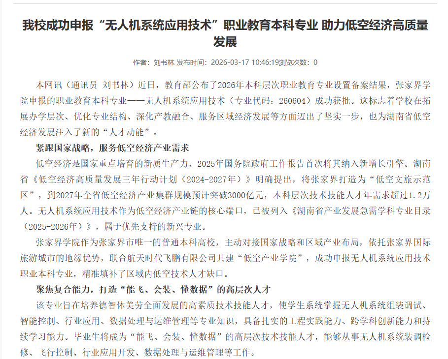 近日,教育部公布了2026年本科层次职业教育专业设置备案结果,张家界学院申报的职业教育本科专业——无人机系统应用技术(专业代码:260604)成功获批。这标志着学校在拓展办学层次、优化专业结构、深化产教融合、服务区域经济发展等方面迈出了坚实一步,也为湖南省低空经济发展注入了新的“人才动能”。