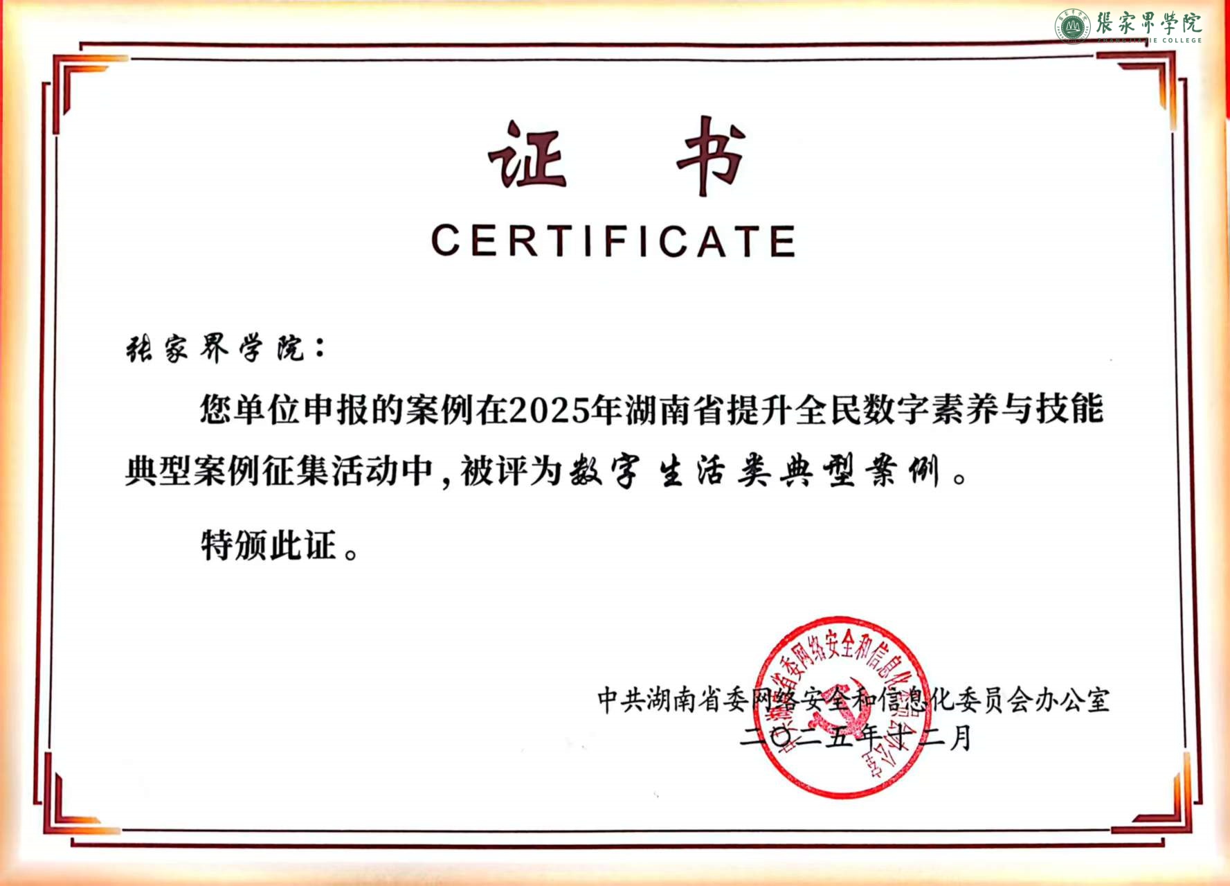 近日,中共湖南省委网信办、省教育厅、省科技厅、省工业和信息化厅联合公布 2025 年湖南省提升全民数字素养与技能典型案例名单,张家界学院申报的《智慧校园建设 —— 提升师生数字素养与技能的创新实践》成功入选数字生活类典型案例,这是省级主管部门对学校智慧校园建设及师生数字素养培育工作的高度认可。