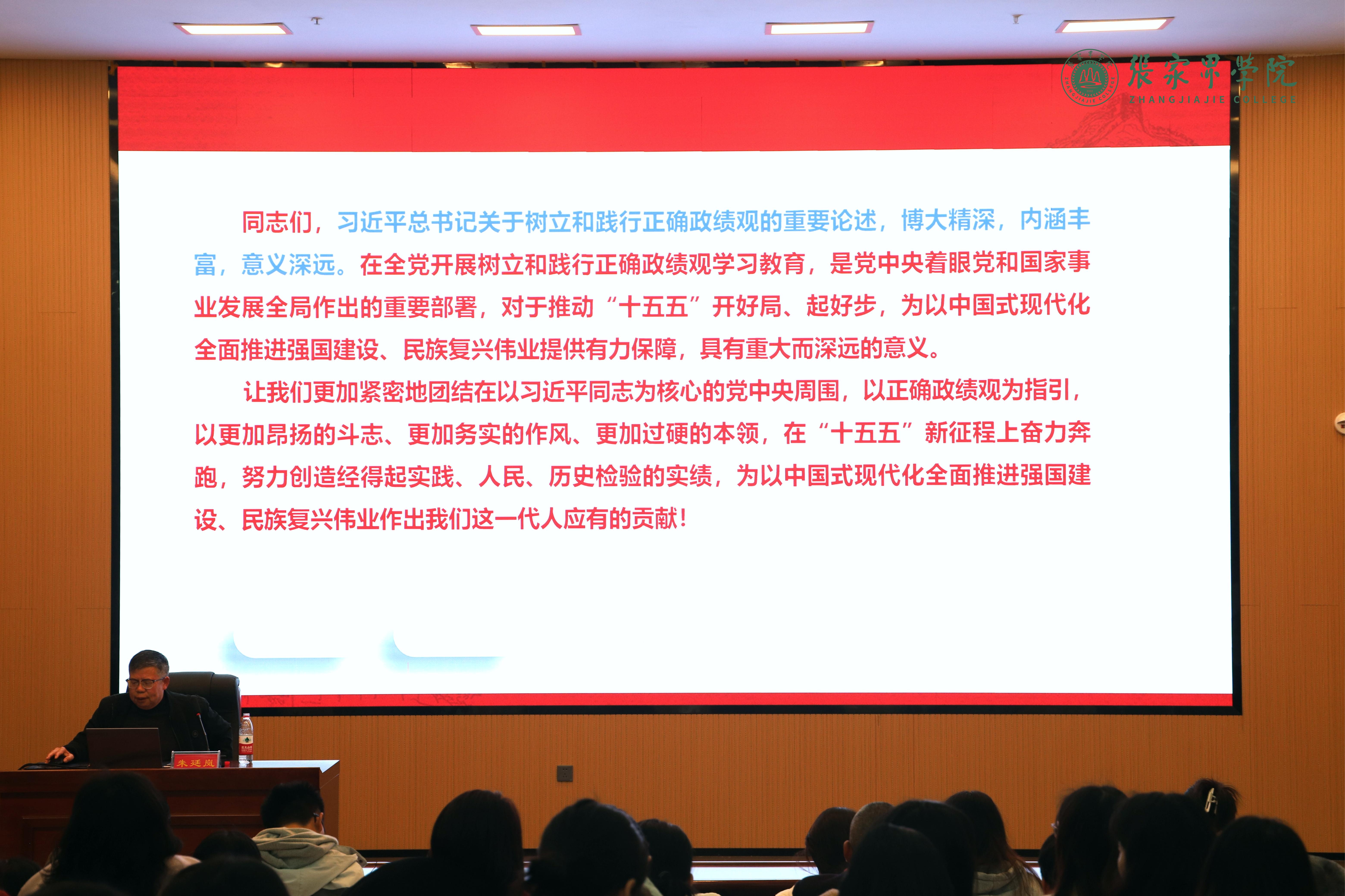 为深入学习贯彻习近平总书记关于树立和践行正确政绩观的重要论述,切实加强学校党员队伍建设,筑牢师生党员思想根基,3月24日晚,我校组织全体教师党员与学生党员开展专题学习宣讲活动,马克思主义学院(法学院)学科带头人朱廷岚教授担任主讲人,带领全体师生党员深入学习领会正确政绩观的核心要义与实践要求,推动学习教育走深走实。学校党委书记王宾吾参加活动。