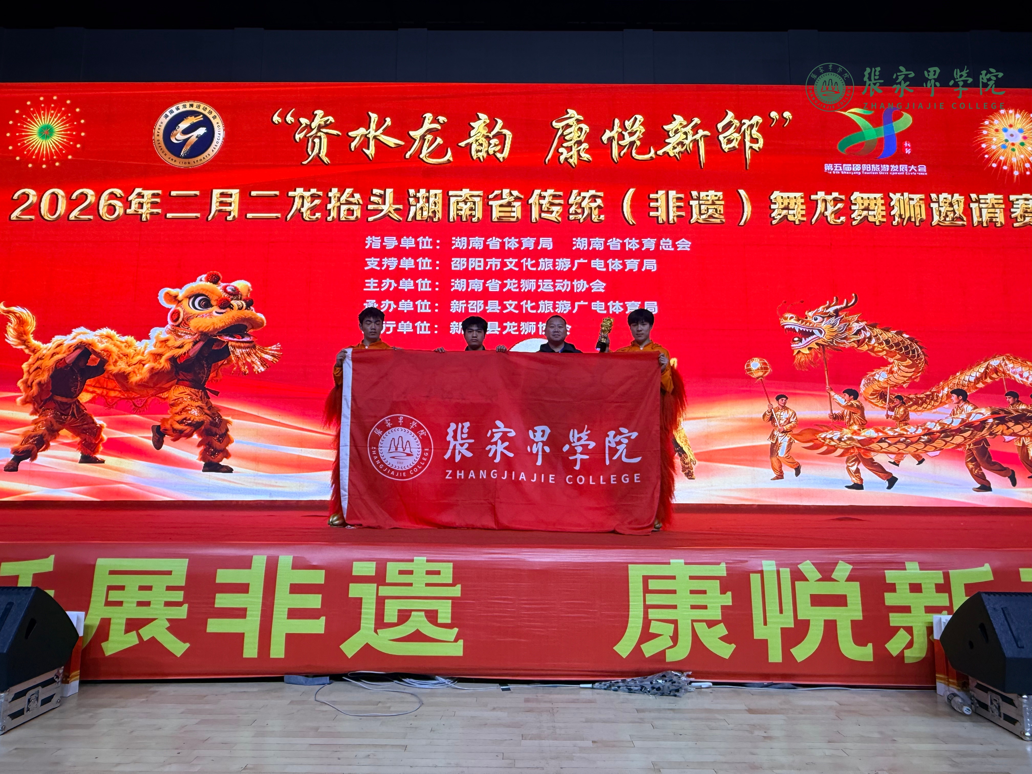 3月19日至20日,“二月二龙抬头”湖南省传统(非遗)舞龙舞狮邀请赛在新邵县举行,张家界学院舞狮队奋勇拼搏,在北狮自选项目中高分夺冠。