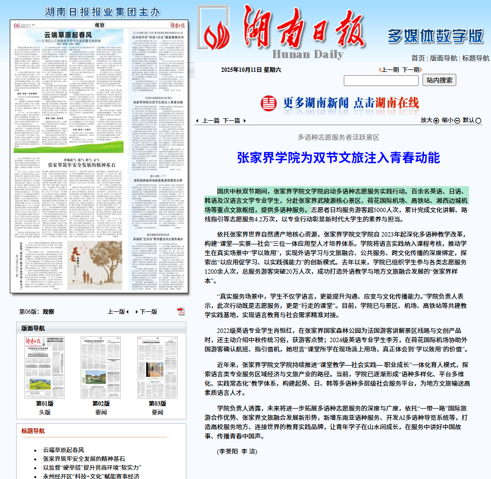 国庆中秋双节期间,张家界学院文学院启动多语种志愿服务实践行动。百余名英语、日语、韩语及汉语言文学专业学生,分赴张家界武陵源核心景区、荷花国际机场、高铁站、湘西边城机场等重点文旅枢纽,提供多语种服务。