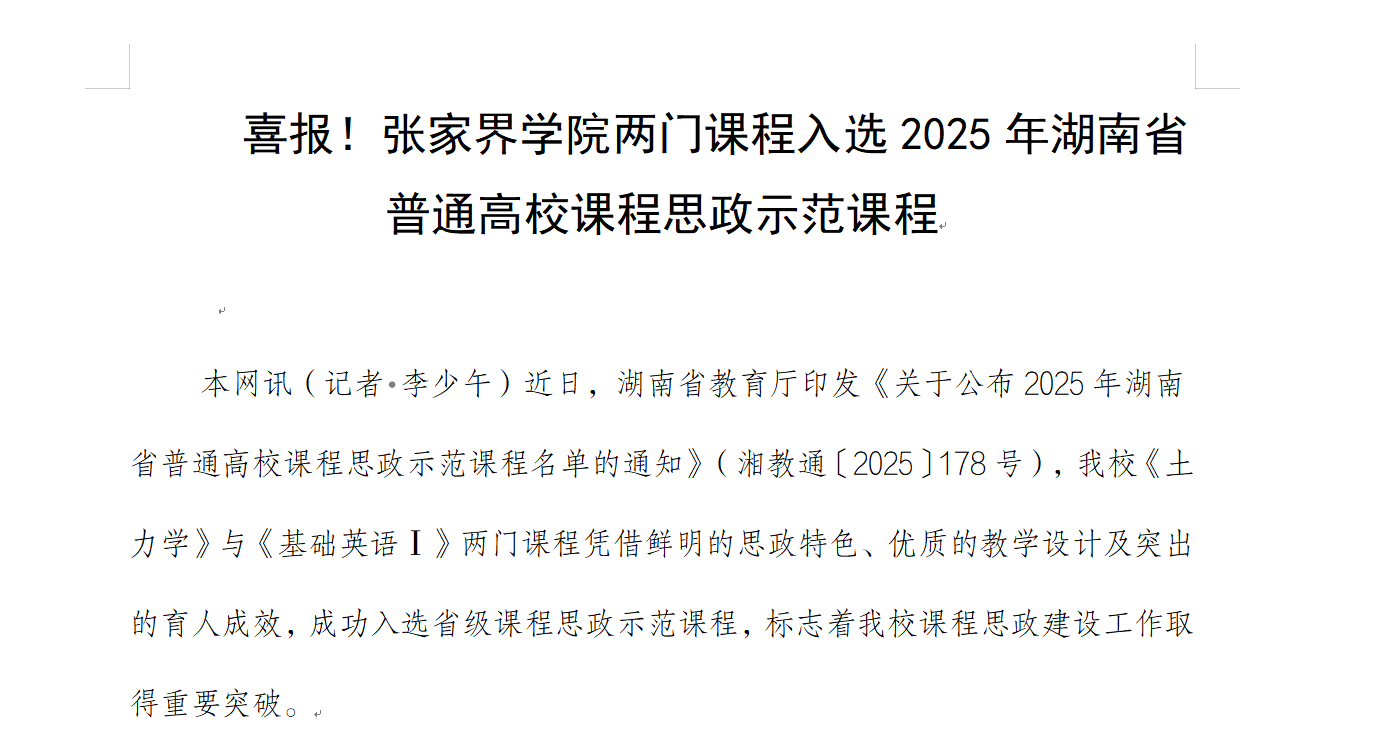 喜报!张家界学院两门课程入选2025年湖南省普通高校课程思政示范课程