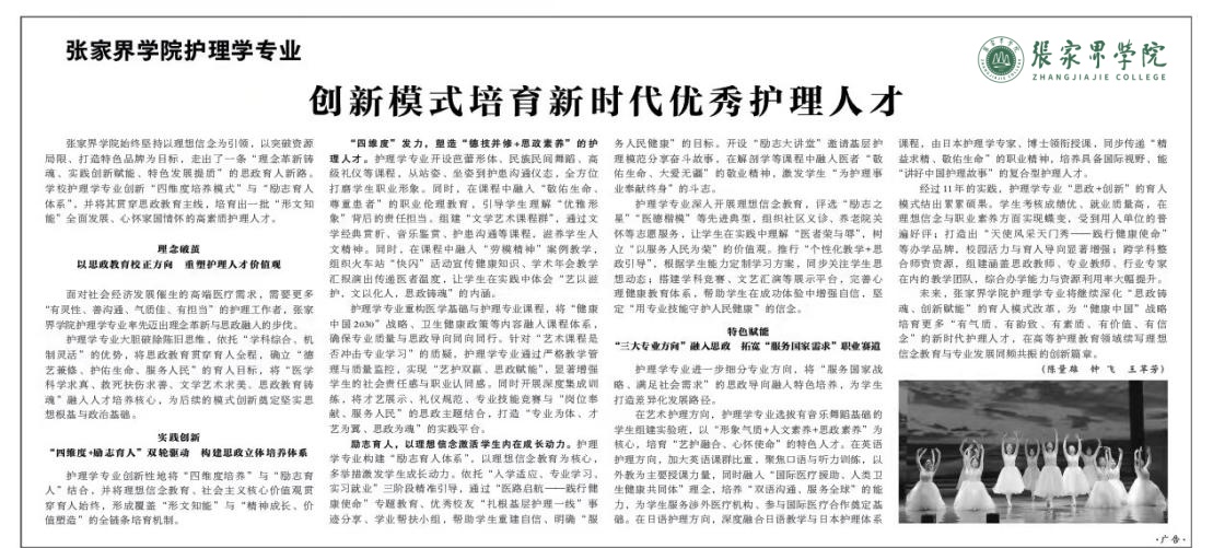 10月26日,《张家界学院护理学专业:创新模式培育新时代优秀护理人才》一文在《光明日报》教科文新闻栏目刊发,系统介绍了我校在护理人才思政育人与特色培养方面的显著成效。